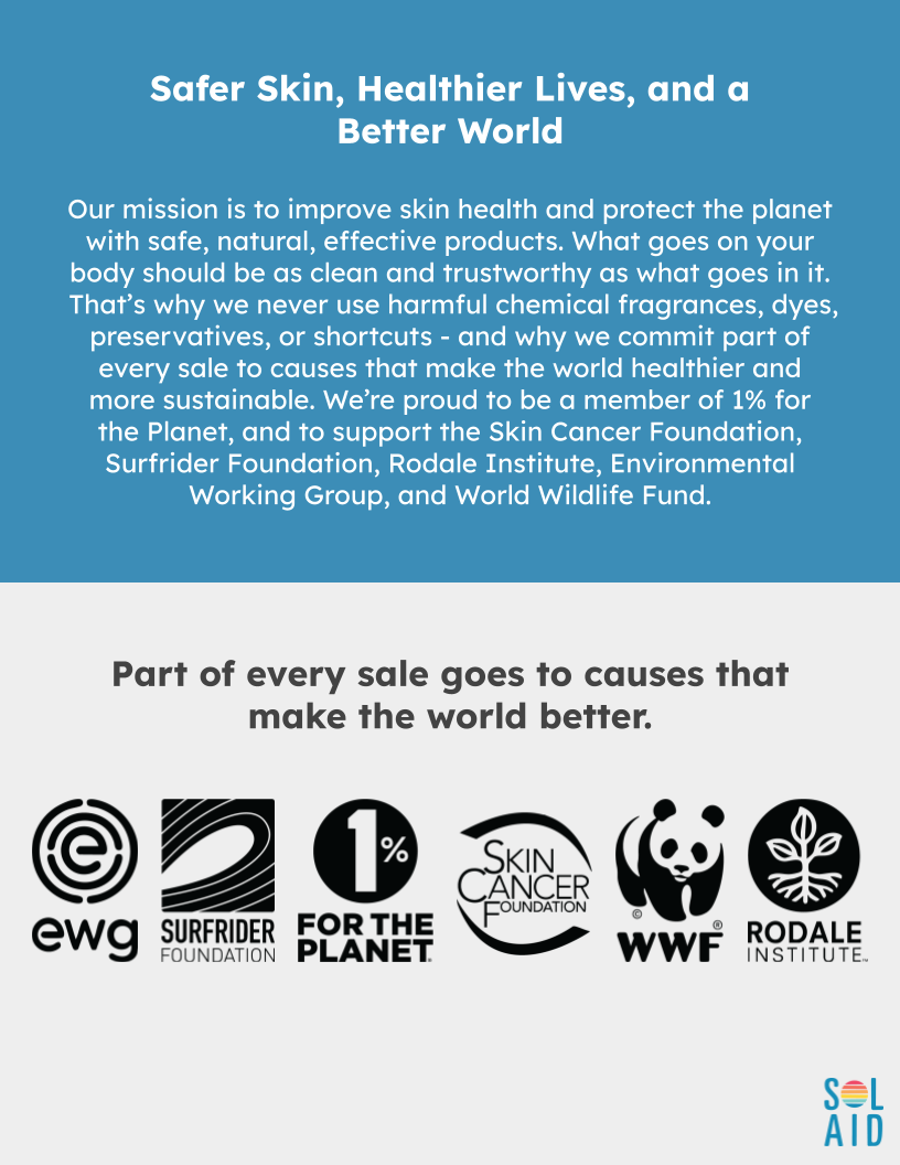 We don’t cover up the scent of what works - we embrace it. Because tropical fragrances don’t promote skin health. And beyond the bottle, our mission is bigger: to improve skin health and protect the planet with products that are clean, honest, and responsible. That’s why part of every sale goes to help the world - from skin cancer prevention to regenerative farming and ocean protection.