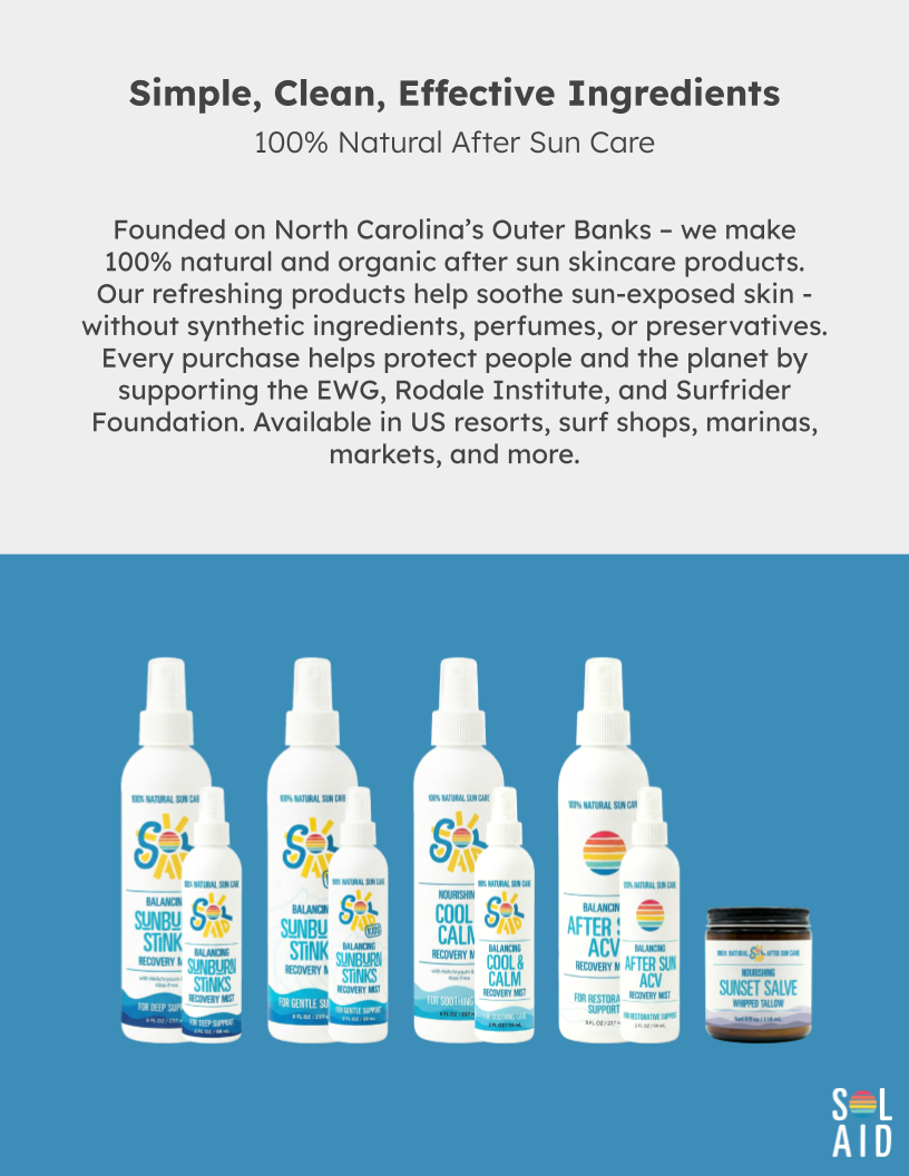 Born on the Outer Banks, Sol Aid is a 100% natural after-sun spray that soothes sunburned skin effectively without harmful ingredients. Made for sun-chasers, wave-riders, and anyone who knows healing should feel like nature: cool, clean, and real - made with a mission to protect both skin and planet.
